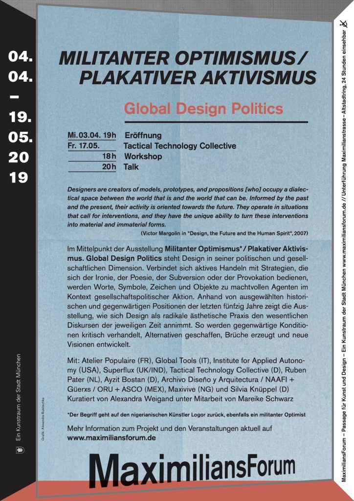 With works by Archivo Diseño y Arquitectura / NAAFI + Güerxs / ORU + ASCO (MEX), Atelier Populaire (FR), Ayzit Bostan (D), Global Tools (IT), Institute for Applied Autonomy (USA), Silvia Knüppel (D), Maxivive (NG), Ruben Pater (NL), Superflux (UK/IND) & Tactical Technology Collective (D)