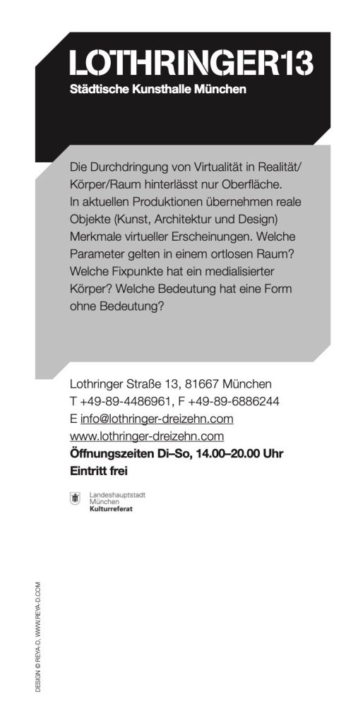 The permeation of the virtual into reality/body/space only creates surface. In contemporary productions, physical objects (art, architecture, design) take on characteristics of virtual representations. What parameters are valid in a spaceless space? What fixed points distinguish a medialised body? What is the meaning of a form without meaning?